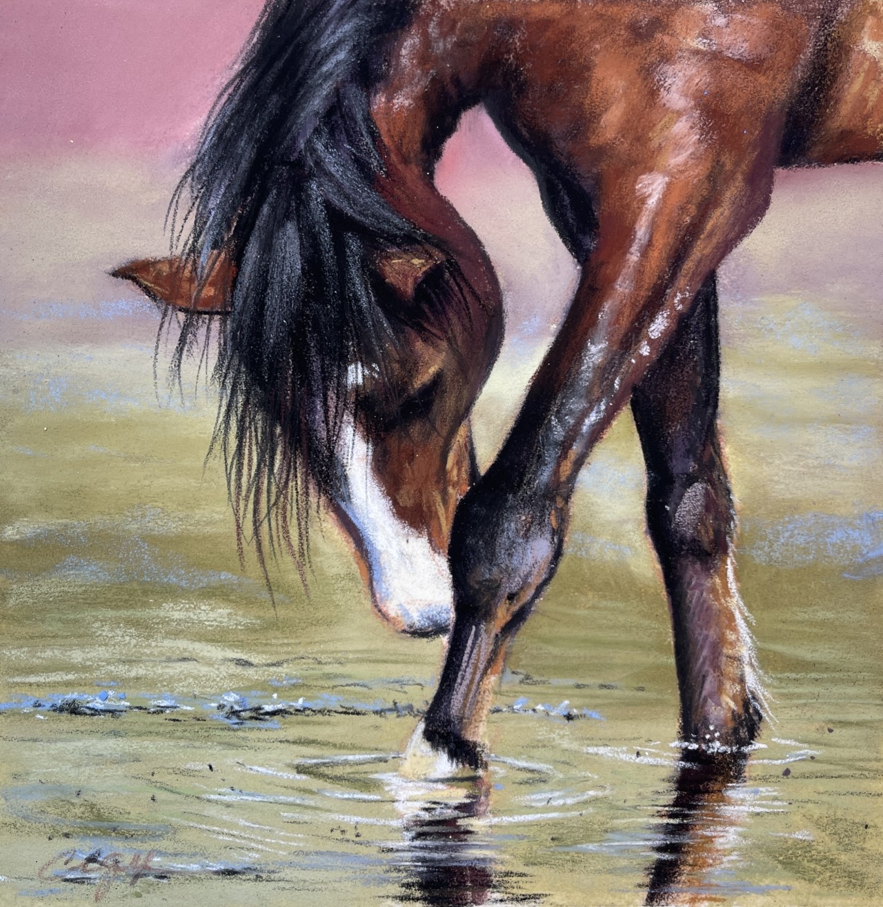 In this lesson, we begin with a bold alcohol underpainting to block in values, establish movement, and create an energetic foundation for this expressive horse at water’s edge. Once the wash dries, we build rich pastel color on top—layering, glazing, and refining to bring out glowing highlights, deep shadows, and shimmering reflections. This approach keeps things loose at first, then intentional and confident as we add color. It’s structured, but it still feels alive.